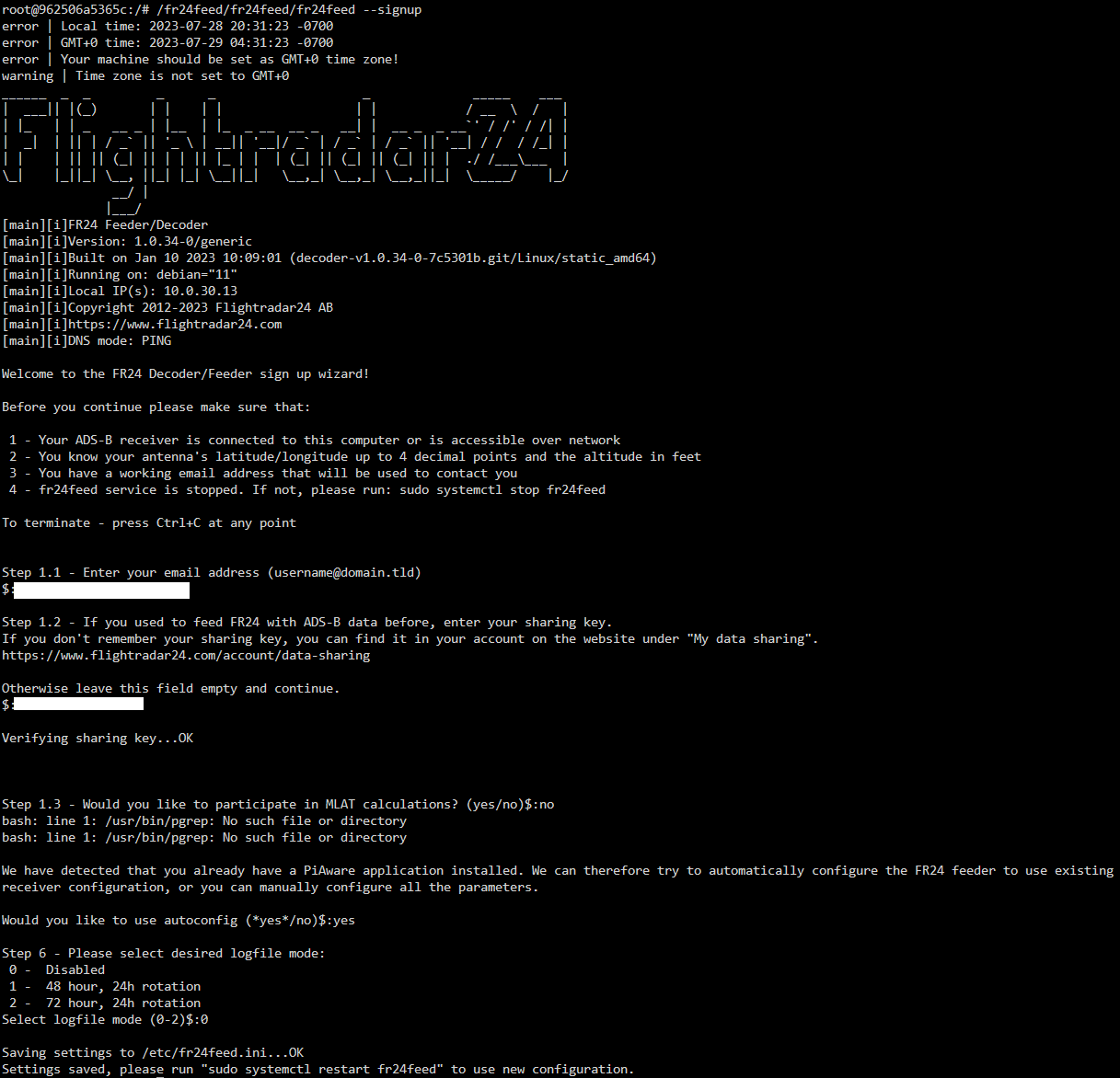 This will open a bash instance within the container. We need to run the following command to begin the Fr24 setup process: