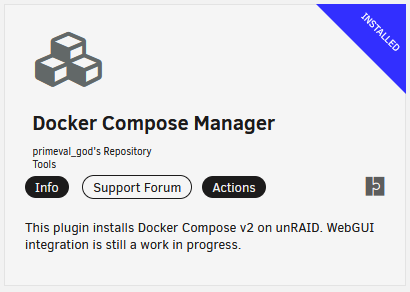 Back in Unraid, navigate to the apps page and install the Docker Compose Manager plugin. This plugin will allow us to create and manage Docker Compose stacks from the Docker tab in Unraid.